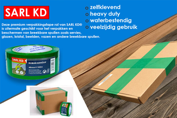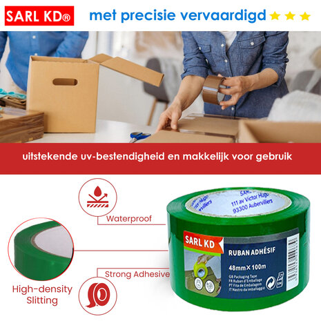 Excellent quality for safe shipments This high-quality packaging tape from SARL KD® offers strong adhesion to various surfaces and does not age quickly, allowing it to be stored for a long time. Thanks to its bright colour, the tape is perfect for a neat and professional finish to your boxes. Ideal for protecting fragile items Especially suitable for carefully packing fragile items such as: ✔ Tableware ✔ Glasses ✔ Crystal ✔ Statues ✔ Vases ✔ Other fragile objects Benefits of this tape: ✅ Strong adhesive power – Sticks immediately and holds firmly ✅ Reinforces boxes – Reduces the chance of damage during transport ✅ Easy to unroll – Without unwanted sticking or breaking ✅ Long-lasting quality – Resistant to aging ✅ Solid seal – Ensures sturdy, safe shipping Specifications: Dimensions: 48 mm x 100 meters Color: Green Storage tips for optimal quality: ✔ Store dry & dark (UV radiation can affect the glue) ✔ Temperature: 17-25°C (too warm storage can cause glue to ‘sweat’) ✔ Humidity: 40-60% Perfect for: 📦 Safely packing valuables 📦 Firmly closing moving boxes 📦 Professional packing for shipping With us you benefit from attractive graduated prices: the more rolls you order, the lower the price per roll! This makes our premium packaging tape not only of high quality, but also extra affordable for larger packages or commercial use. Choose reliable quality and protect your packages with this sustainable packaging tape!